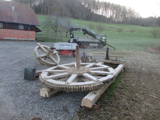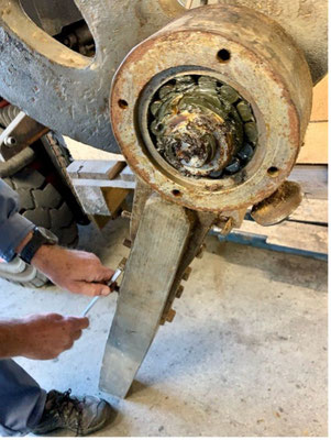 Dazu war es notwendig alle Komponenten auf dieser Welle zu entfernen. Dies war, bis auf das Schwungrad, mit viel Kraftaufwand möglich. Das folgende Bild zeigt den stark verschobenen Keil des Schwungrades. Ein Abziehen war nicht möglich. Es war notwendig, die Welle zu zersägen, und wir müssen sie neu fertigen.